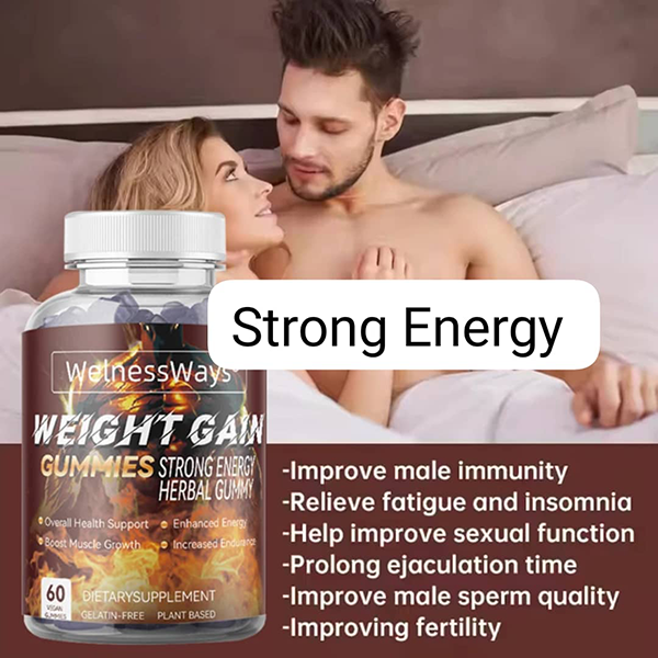 Weight Gain Gummies is a blend of Maca Root extract, Ashwagandha Root extract, Tribulus Terrestris extract, Rhodiola Rosea extract, Panax Ginseng Root extract etc. This Strong Energy Herbal Gummies help to boost muscle growth, provide, overall health support. Improve male immunity, relieve fatigue and insomnia. It also help to Increase endurance, enhance energy, improve sexual function, prolong ejaculation time, improve male sperm quality thus improving fertility.